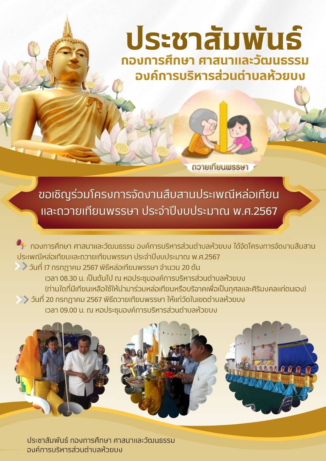 ขอเชิญร่วมโครงการจัดงานสืบงานประเพณีหล่อเทียนและถวายเทียนพรรษา ประจำปีงบประมาณ พ.ศ.2567