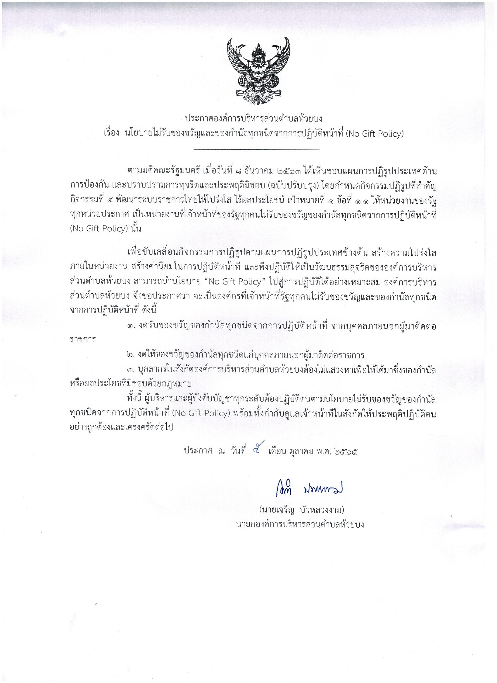 ประกาศเจตนารมณ์นโยบาย No. Gift Policy จากการปฏิบัติหน้าที่